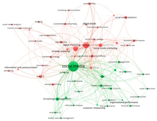 The results are grouped into two major clusters (Figure 5). The red cluster focuses on “digital marketing” and “sustainability,” while the green cluster addresses “SMEs’ specific social media usage” such as knowledge management, human resource management, and customer engagement. The findings provide valuable perspectives and tools for understanding past studies on SMEs’ social media usage. SMEs that adopt digital or social media marketing strategies have a higher chance of increasing their sales and improving customer retention [24,67]. SMEs’ use of social media for knowledge management can lead to improved employee productivity and better decision-making [56]. Human resource management practices in SMEs can also be positively impacted by social media usage, as it can assist in recruitment, employee training, and team collaboration [75]. Furthermore, SMEs that use social media for customer engagement and build online communities have a higher chance of creating a sense of loyalty and brand advocacy among their customers [54,55]. Technological adoption and strategic transformation in digital marketing, e-commerce, and internationalization seem crucial success factors for social media adaptation.