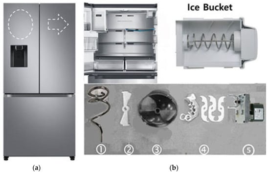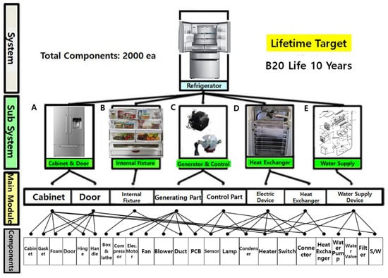 For instance, a refrigerator uses the heat pump cycle that consists of a condenser, capillary tube, evaporator, and compressor. In a heat exchanger, cooled air is produced to prevent the spoilage of food in the refrigerator and freezer sections. Figure 1 shows that a refrigerator covers some systems (or modules): the cupboard and door, shelves and boxes, compressor or motor, evaporator and condenser, water supply and ice-making apparatus, controller, and diverse parts. A domestic refrigerator includes as many as 2000 elements. It can be divided into up to 20 units (or 8~10 modules) holding 100 elements each.
