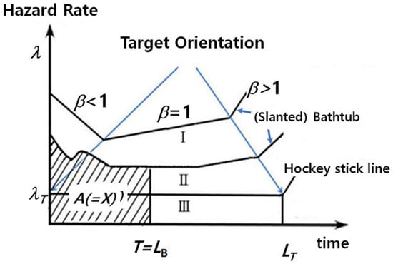 Reliability can be described exactly as the potential for a product to perform under a set of prescribed operational/environmental situations for a required period of time []. It is often demonstrated as the bathtub (Figure 2). This figure shows three curves. Each curve may be expressed in accordance with the shape parameter in the Weibull chart. In the 1st division, there is a declining rate of failure in the premature section of the system’s life (β < 1). In the 2nd division, there is a uniform rate of failure (β = 1) in the medium lifetime of the system, pursuing an exponential distribution. Finally, there is a growing rate of failure to the ending of the product life (β > 1), which follows a Weibull distribution.