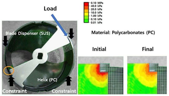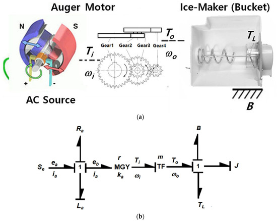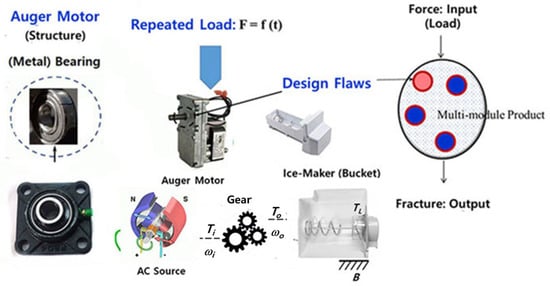 Because customers wanted to have (cubed or crushed) ice, an ice-maker was developed to be included in a household refrigerator. The major components in a household ice-maker are the geared auger motor, bucket case, helix upper dispenser, blade, etc. An auger motor has two or more gears working together by interlocking their teeth and revolving each other to produce torque and speed. As the motors are engaged, the geared trains lessen the speed of the augers and increase the torque. The auger motor operated by the alternating current (AC) grows the torque by gearbox to break it up at the end of an ice-maker. As a consumer pushes the lever with a cup on the dispenser, (cubed/crushed) ice flows to fill the cup. Consequently, the ice-maker shall be subjected to repeated stresses due to loading/unloading in the process of crushing ice. If there are structural flaws, such as an inadequate strength to withstand repeated loads, the ice-maker can be successful before satisfying its targeted life. That is, failure happens when the materials in the system parts are too fragile to withstand the exerted stress under environmental circumstances [].