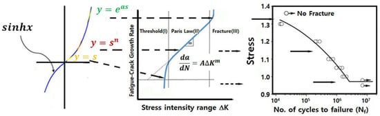 Denotation of the hyperbolic sine stress in the Paris law and S–N curve.
