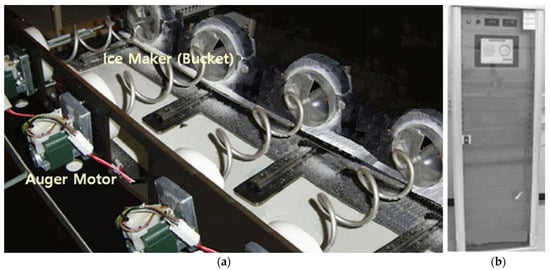 A household refrigerator equipped with ice-maker. (a) Household refrigerator; (b) components of a domestic ice-maker: helix support ①, blade dispenser ②, helix upper dispenser ③, blade ④, and auger motor ⑤.