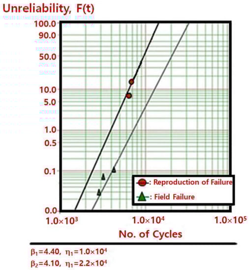 The Weibull distribution for system lifetime is extensively employed because it is defined as an expression of the characteristic life, η, and shape parameter, β. Therefore, if the system keeps to the Weibull distribution, the accumulative failure rate, F(t), in Equation (1) is defined as