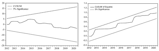 CUSUM and CUSUMSQ results. Note: CUSUM = Cumulative sum, CUSUMSQ = Cumulative sum of squares.