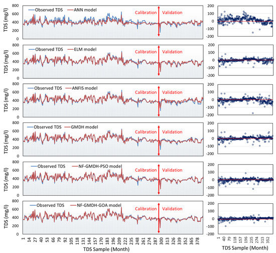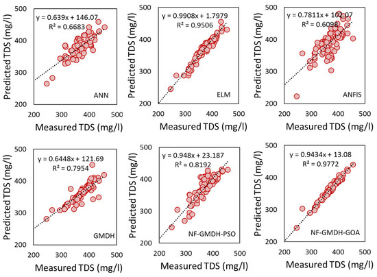 Moreover, the scatter plots of TDS observations, via predictions and observations, are presented in Figure 6 for the Soleyman-Tangeh station. The obtained slope lines of the TDS values for NF-GMDH-GOA model were near to the best-fitting line; however, some TDS values were underestimated. The ANN and ANFIS models could not estimate the WQP parameter more precisely than the other models, and this indicates the poor performance of these models for TDS modeling.