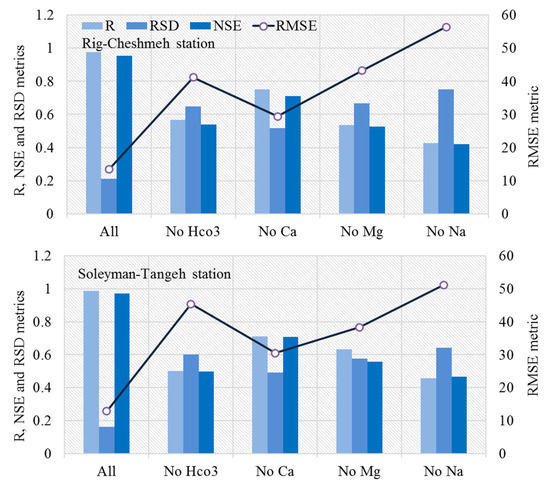 As seen in Figure 8, error criteria showed that Na with the lowest value of accuracy (R = 0.426) had the highest influence on the TDS estimation for the Rig-Cheshmeh station. By removing Na from the model, other criteria included RMSE, RSD, and NSE for TDS modeling, which were 56.404 mg/L, 0.752, and 0.421, respectively. Similar to what was found in the Rig-Cheshmeh station, Na with R (0.458) and RMSE (51.254 mg/L) was the most important parameter in TDS prediction for the Soleyman-Tangeh station. According to the sensitivity result, the main factor which may have contributed to the large amount of Na is the land use in, and land cover of, the area. In the downstream part of the region, which covers the agricultural sectors, due to the use of chemical fertilizers, the amount of Mg in this region essentially contributes to TDS. In general, contributors for the Na and Mg that cause water quality pollution in this region are the use of rivers to transport urban and industrial wastewater and the drainage of agricultural and horticultural fields.