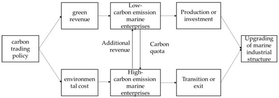 In summary, the carbon trading policy guides and restricts the marine industry through market-based means. High-carbon emitting marine enterprises will be burdened with huge environmental costs and face the pressure of transformation. Marine enterprises with low carbon emissions can reap “real gold and silver”, obtaining additional green benefits through carbon emissions trading, and directly using this additional income for production or investment, technological innovation, or scale expansion, resulting in the restructuring and upgrading of the marine industry. A theoretical framework is drawn to provide a detailed overview of the main research ideas, as shown in Figure 1.