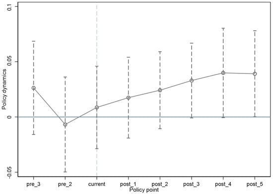 Table 4 shows the results of the parallel trend hypothesis test, where pre_3 indicates the third year before the carbon emissions trading pilot, pre_2 indicates the second year before the carbon emissions trading pilot, and pre_1 indicates the first year before the carbon emissions trading pilot. To avoid multiple co-linearities, pre_1 is used as the baseline group and pre_1 is dropped. As shown in Table 4 and Figure 2 below, before the carbon emission trading pilot, none of the regression coefficients are significant, indicating that there is no significant difference of the marine industry structure between the experimental groups and control groups before the carbon emission trading pilot; after the carbon emission trading pilot, the regression coefficients gradually start to be significant and the marine There is a significant difference of the industrial structure between the experimental groups and control groups. The results in Table 4 and Figure 2 below indicate that the parallel trend test hypothesis is passed and the previous double-difference regression results are plausible.