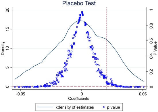 In order to exclude other random factors from confounding the results, a placebo test was conducted by fictitious treatment groups. Since there were four actual pilot coastal provinces, this paper is conducted by randomly selecting four provinces as the fictitious policy pilot provinces, i.e., the treatment group, repeating the fictitious process 500 times and finally observing whether the coefficients on the ‘pseudo-policy dummy variables’ were significant.