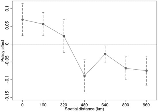 Within 160 km around the pilot provinces, the carbon trading policy has the same significant positive promotion effect on the structure of the marine industry in the surrounding provinces, but the impact coefficient of the policy gradually decreases, that is, spatial spillover occurs. Briefly, when the carbon trading policy has an impact on the marine industrial structure of the pilot province, the neighboring provinces of that pilot will be driven to upgrade the marine industrial structure due to the significant presence of labor and capital flows and knowledge spillover.