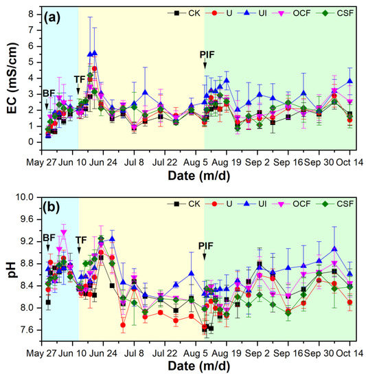 The EC and pH values in surface water of all treatments had a violent fluctuation trend during the entire rice-growing season (Figure 1). At the BF stage, the highest average EC value in surface water was observed in OCF treatment, followed by CSF, UI, U, and CK treatments. Compared to CK (1.07 ± 0.55 mS/cm), the EC values in UI (1.67 ± 0.98 mS/cm), OCF (1.89 ± 1.15 mS/cm), and CSF (1.70 ± 0.70 mS/cm) treatments demonstrated a statistically significant (p < 0.05) increase, respectively. The average EC values at the TF stage were CK < OCF < U < CSF < UI, and at PIF stage were CK < U < CSF < OCF < UI. The UI treatment at both TF and PIF stages had significantly (p < 0.05) higher average EC values than all the other four treatments. The average pH values at the BF stage were CK < CSF < UI < U < OCF, at the TF stage were U < CK < OCF < CSF < UI, and the UI treatment (8.57 ± 0.38) at the TF stage had a statistically significant (p < 0.05) higher pH value than U (8.24 ± 0.43) and CK (8.31 ± 0.25) treatments, respectively. At the PIF stage, the average pH values were U < CSF < CK < OCF < UI and the UI treatment had a significant (p < 0.05) higher average pH value than all the other four treatments. The average pH value in OCF treatment (8.53 ± 0.38) was significantly (p < 0.05) higher than U (8.16 ± 0.33) and CSF (8.18 ± 0.29), respectively.