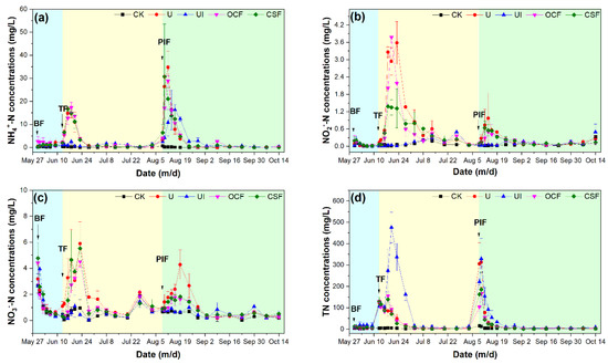 Concentrations of NH4+—N (a), NO2−—N (b), NO3−—N (c), and TN (d) in surface water of saline-alkali paddy fields with different N-fertilizer treatments during the rice-growing season. BF (blue background): basal fertilizer stage; TF (yellow background): tillering fertilizer stage; PIF (green background): panicle—initiation fertilizer stage. Data presented as mean ± standard deviation (n = 3).