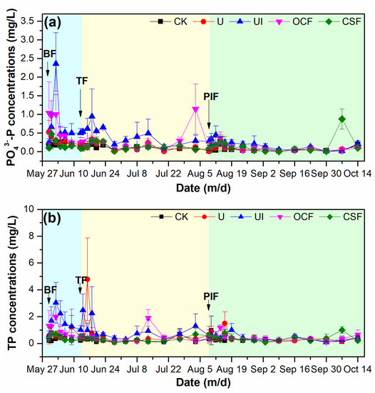 Concentrations of PO43−—P (a) and TP (b) in surface water of different N—fertilizer treatments during the rice-growing season. BF (blue background): basal fertilizer stage; TF (yellow background): tillering fertilizer stage; PIF (green background): panicle—initiation fertilizer stage. Data presented as mean ± standard deviation (n = 3).