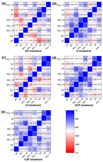 Correlations of pH, EC, and various forms of N and P in surface water of saline-alkali paddy fields with different N-fertilizer applications ((a): CK, (b): U, (c): UI, (d): OCF, and (e): CSF) during the entire rice—growing season (n = 102). * and ** represent significance at p < 0.05 and 0.01, respectively.