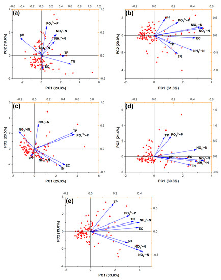 Principal component analysis (PCA) of N and P indices in surface water of saline-alkali paddy fields with different N-fertilizer application ((a): CK, (b): U, (c): UI, (d): OCF, and (e): CSF) during the entire rice—growing season (n = 102).