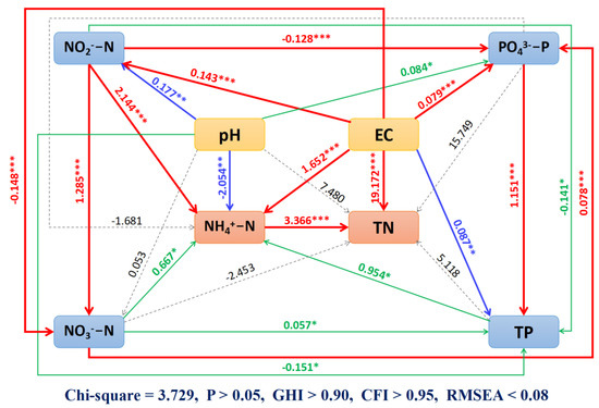 Simplified structural equation models (SEMs) representing hypothesized causal relationships among NH4+—N, TN, and physiochemical parameters in surface water of saline-alkali paddy fields during the entire rice-growing season. *, ** and *** represent the significant levels of p < 0.05, 0.01, and 0.001, respectively. Chi-Square: the difference between the expected covariance matrix and the covariance matrix of the data; P: the significance of fit index; GFI: the goodness of fit index; CFI: the Bentler’s comparative fit index; RMSEA: the root mean square error of approximation. The numbers on the arrows indicate the strength of the relationships between variables and are used to analyze causal relationships.