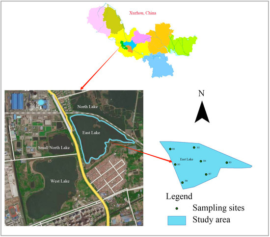 Based on the water system of Jiuli Lake wetland and the level of human disturbance, the east lake of Jiuli Lake was selected as the sampling area. Seven fixed sampling points were set in accordance with the characteristics of the lake area (refer to Figure 1). Sampling was carried out in April 2021 (the normal season), August 2021 (the wet season), and December 2021 (the dry season). A portable 2.5-liter plexiglass water collector was used to collect the overlying water (0.5 m above the surface), while the surface sediment (approximately 20 cm) was collected using a Peterson sediment sampler. All samples were collected on the same day and transported to the laboratory for analysis.