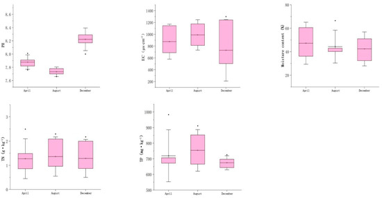 Figure 2 illustrates the temporal variations of the physicochemical properties of sediments in East Lake of Jiuli during the study period. Sediment pH demonstrated a small variation range in each period, with the highest values observed in December, followed by April and August. The conductivity showed a pattern of August > April > December, with fluctuations observed among sampling points. The average sediment moisture content was over 40%, and there was a significant difference in the moisture content among sampling points, with fluctuations observed in April and December. The moisture content was highest in August, followed by April and December, indicating that the sediment moisture content was influenced by seasonal changes. This is likely due to abundant rainfall and a high water table during the summer and lower levels during the winter. The TN content in sediments varied with August > December > April, indicating higher TN content in summer and lower TN content in spring. The overall variation of TP content was relatively low and differed slightly from TN in terms of time variation, with the highest values observed in August, followed by April and December. The content of TP was higher in the summer and lower in the winter.