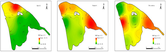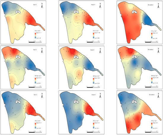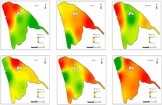 As shown in Table 1. Overall, the study found that water temperature was highest in August and lowest in December, with a relatively concentrated distribution in each period. This variation in lake water temperature is closely related to seasonal changes, with higher temperatures in summer and lower temperatures in winter. These results are consistent with previous studies. Additionally, pH values of the bodies of water were weakly alkaline, ranging from 6 to 9, with the highest values in December, followed by April and August. Conversely, dissolved oxygen (DO) showed a pattern opposite that of temperature, with the highest values in December, followed by April and August. The study also found that total nitrogen (TN) concentrations decreased gradually over time, with the highest values in April, followed by August and December. The seasonal variation in total phosphorus (TP) concentrations was slightly different from that of TN, with the highest values in April, followed by December and August, but the overall difference between August and December was not significant.