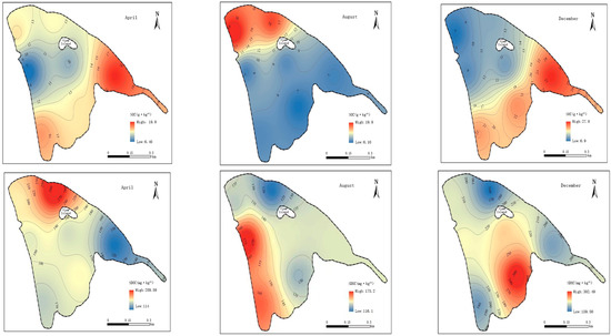 - The temporal variation of WDOC and WDIC showed opposite trends. WDTC is the sum of WDOC and WDIC, is jointly controlled by both, and is the main dissolved carbon in the water. The spatial distribution of WDOC and WDIC in the overlying water changes significantly with the seasons due to the influence of phytoplankton and hydraulic action in the lake area. The temporal variation of SOC and SDOC was similar, with higher concentrations in December, followed by April and August. Their spatial distribution was greatly affected by algae growth activities. SIC and SDIC exhibited consistent temporal variations, with higher concentrations in August and lower concentrations in December. The concentrations of SIC and SDIC complemented each other in their spatial distribution;