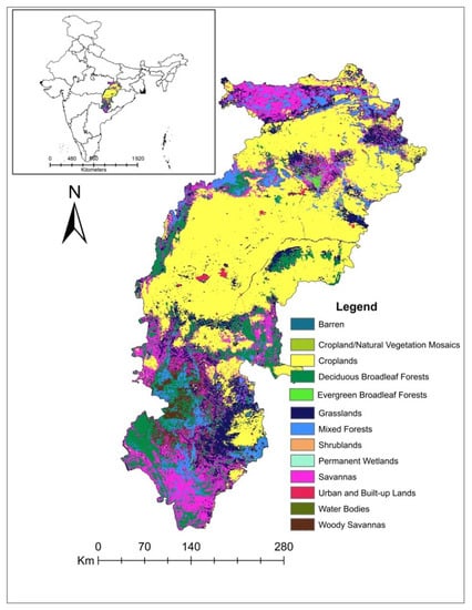 MODIS land cover data for the year 2018 was obtained at a spatial resolution of 500 m from NASA’s Earth Explorer. This data is derived from the MODIS (Moderate Resolution Imaging Spectroradiometer) satellite, which uses supervised classification of MODIS reflectance data to create a land use land cover (LULC) map (MCD12Q1) [25,26]. The MCD12Q1 data is provided in tile format at the equator using a Sinusoidal grid in HDF4 file format and has been collected since 2001. For this study, the LULC map for the state of Chhattisgarh was extracted and overlaid on the satellite-based MODIS active fire data from 1 January 2005 to 31 December 2021 to identify forest fires within the state. The use of MODIS Land Cover data allows for the identification and mapping of different land use and land cover types, providing valuable information for the analysis of land use patterns and trends.