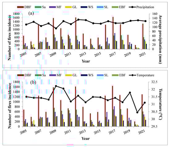 (a) Number of annual fire incidences versus annual precipitation and (b) annual fire incidences versus temperature in Chhattisgarh between 2005 and 2021. [DBF = Deciduous Broadleaf Forests, Sa = Savannas, MF = Mixed Forests, GL = Grasslands, WS = Woody Savannas, SL = Shrublands, EBF = Evergreen Broadleaf Forests].