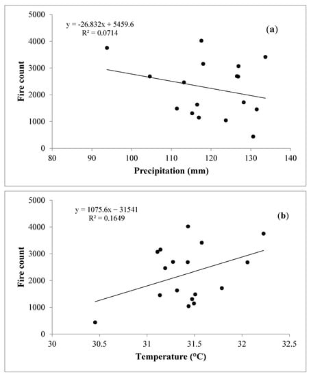 Scatter plot of fire counts versus (a) precipitation (mm) and (b) temperature (°C).