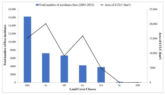 Geographical analysis of fire incidences over different forest types revealed that the total number of fires in deciduous broadleaf forests, savannas, mixed forests, grasslands, woody savannas, shrublands, and evergreen broadleaf forests were 680, 224, 300, 112, 154, 7, and 10, in 2005, which increased to 1300, 608, 489, 397, 268, 7, and 5, in 2021, respectively (Table 2). The total number of fires between 2005 and 2021 were recorded in DBF, Sa, MF, GL, WS, SL, and EBF were accounted as 16,206, 7193, 6634, 4203, 3786, 139, and 54, respectively (Figure 5). DBF was the most prone to fires, followed by Sa. Forest-wise mean value shows that deciduous broadleaf forests recorded 953 highest mean value followed by savannas recorded 423, whereas shrublands and evergreen broadleaf forests showed lesser mean values of 8 and 3, respectively (Table 2).