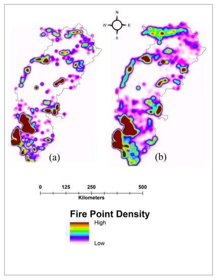 The spatial distribution of forest fire maps generated for 2005 (Figure 6a) and all fire points from 2005 to 2021 (Figure 6b) revealed that fires were not evenly distributed throughout the study area. Most fire points were found in the southwest regions, which are part of the Bastar Plateau of Chhattisgarh. These regions, which are predominantly covered with DBF, were highly prone to fires, while hotspot density was lower in the northern regions, which are part of the Northern Hill of Chhattisgarh.