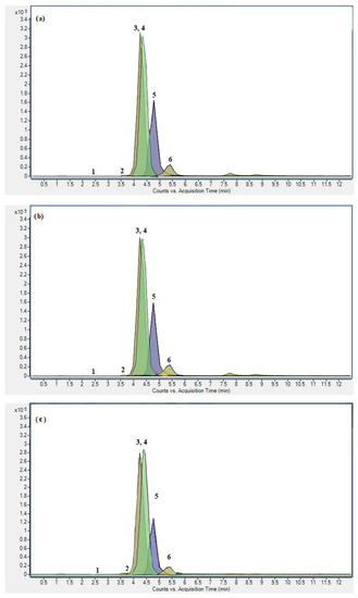 UPLC ESI-MS2 chromatogram in MRM acquisition mode of black chokeberry pomace extracts obtained under (a) optimized MAE, (b) optimized UAE, and (c) CE. (1) Cyanidin-3-hexoside-(epi)catechin, (2) Cyanidin-3-pentoside-(epi)catechin, (3) Cyanidin-3-O-galactoside, (4) Cyanidin-3-O-glucoside, (5) Cyanidin-3-O-arabinoside, and (6) Cyanidin-3-O-xyloside.