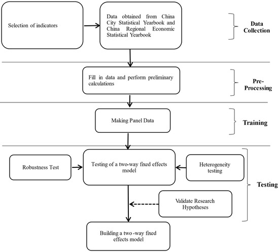 The method involves several key steps. The first step is to determine the research topic by reviewing the relevant literature and identifying the necessary indicators and calculation methods. The second step is to extract relevant data from the China Urban Statistical Yearbook and the China Regional Economic Statistical Yearbook and organize it in Excel. The third step is to import the organized data into stata16, fill in any missing data using linear interpolation, and calculate the necessary indicators in Excel. The fourth step is to construct the panel data required for empirical testing. Finally, the fifth step is to test the data using the constructed model to validate the research hypotheses. The flowchart below provides a visual representation of the method (Figure 1).