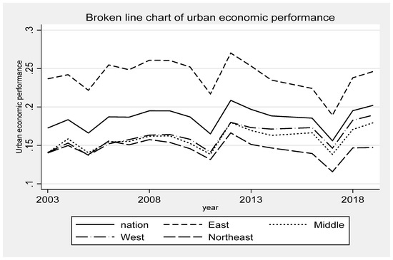 As can be seen from the urban economic performance line chart, the level of urban economic performance nationwide has fluctuated over the 17-year period from 2003 to 2019, but the overall trend has been steady and progressive. Specifically, the eastern region has the highest level of urban economic performance, and urban economic performance is always higher than the national average, and the development rate decreases after 2013. Analyzing the specific reasons, from the perspective of location, the eastern region is the frontier of reform and opening up, with early and fast economic development, a more complete industrial system, and a more mature factor market, so the efficiency of urban economic development in the eastern region is higher than other regions of the country. As the economy gradually enters the “new normal”, the industrial development is in the painful period of transformation and upgrading, which requires the economic development of each region to be oriented to quality and efficiency and try to avoid the “sloppy” economic development method relied on in the past. Therefore, after 2013, the speed of urban economic development has been reduced, and the level of urban economic performance has been slow. Secondly, although the development level of western and central regions is always lower than the national average, the overall trend is up, and the average urban economic performance level of northeastern regions is the lowest in the country, and the development speed is slow and decreasing. Analyzing the specific reasons, China has implemented the strategy of rising in the central part of the country and the strategy of western development, and the economic development of the central and western regions is good, and they have taken over the industrial transfer from the eastern regions, so the development speed is faster, and the level of urban economic performance is improving, among which, the average urban economic performance of the western regions is slightly higher than that of the central regions, mainly in the western regions of Xinjiang Uygur Autonomous Region, Qinghai Province, Ningxia Hui Autonomous Region, etc. There is a serious lack of data on cities, and most of the available data samples are provincial capitals and local resource-based cities, so the development level of the western region is slightly overestimated. The past development of the northeastern region of China relied heavily on natural resource endowments, and with the depletion of natural resources and a single industrial structure, the economy has been sluggish.