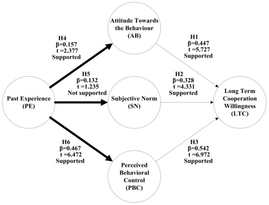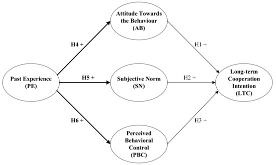 As a significant factor in decision-making processes, past experience is considered an influential determinant of attitudes and perceived behavioral control [68,69]. In this study, the process of choosing long-term cooperative subcontractors is a process of continuous adjustment based on past experience, which includes analyzing internal and external needs, establishing goals, optimizing relations constantly, and conducting pre- and post-event evaluation [2,70,71]. Considering the above literature, there is a basis to be able to integrate past experience into a model which aims to explain long-term cooperative intention formation. Thus, the Hypotheses 4 to 6 were proposed: