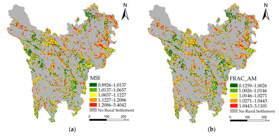 - The number and land use scale of rural settlements in the study area decreased from east to west. The rural settlements in the upper reaches of the Minjiang River and Dadu River basin were the most concentrated, and the Xianshuihe River basin also had banded gathering areas, while the rural settlements in the west were sparse and dispersed. Although the morphology of most rural settlements is relatively simple, the spatial difference is also obvious. Most rural settlements build along rivers and roads, which makes the shape of rural settlements more complex. While the morphology of rural settlements is more regular in plateaus and valley areas.