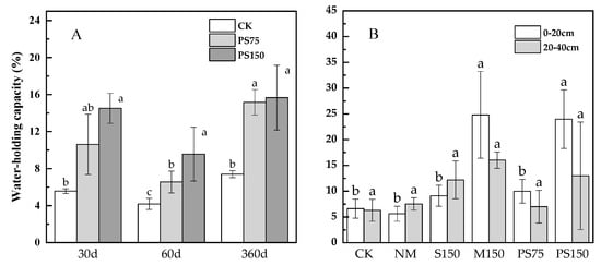 Effects of different treatments on the sandy soil water holding capacity in the pot experiment soil (A), 0−20 cm depth and 20−40 cm depth of field soil (B). Different lowercase letters indicate the change in water capacity of different treatments (p < 0.05). Error bars show the standard error of the means (n = 3).