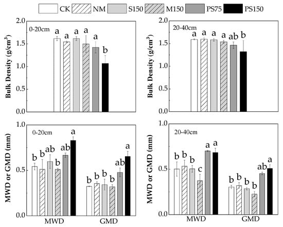 In the pot experiment, when compared with the study control, PS75 increased in large macroaggregate (>2000 μm) proportions and decreased the microaggregates’ rate (<250 μm) (Table 1). In the field experiment (Figure 2), the proportion of large aggregates in PS75 and PS150 in the 0–20 cm soil layer increased by 384.8% and 886.6% in comparison with CK, respectively. The proportion of microaggregates and silt clay-sized fractions in the PS75 and PS150 was lower than in the CK, NM, S150, and M150 treatments (Figure 2). In the 20–40 cm soil layer, the proportion of large macroaggregates and small macroaggregates in the PS150 was notably increased in comparison with CK, NM, S150, M150, and PS75, the proportion of microaggregates and silt clay size fractions in the PS75 and PS150 was notably lower than in the CK, NM, S150, and M150 (Figure 2). In contrast, no significant difference was identified in the proportion of large macroaggregates among CK, NM, S150, and M150 at either soil depth; M150 notably increased the proportion of silt clay-sized fractions at 0–20 cm, whereas it decreased the proportion of small macroaggregates at 20–40 cm.