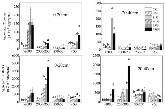 At 0–20 cm, PS75 and PS150 had higher aggregate-associated TC content than CK, NM, and S150. M150 had higher large macroaggregates, small macroaggregates associated TC content than CK, NM, and S150 (Figure 4, p < 0.05). At a depth of 20–40 cm, PS150 had higher all aggregate-associated TC content than CK, NM, and S150, and PS75 had higher large macroaggregates, microaggregate-associated TC content than CK, and NM (Figure 4, p < 0.05).