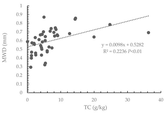 Linear regression analysis of soil total carbon content of sandy soil and MWD under different treatments.