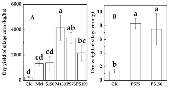 In the field experiment, the pelletized straw and manure incorporation promoted the growth of silage corn. Dry yield of silage corn in the PS75, PS150, and M150 were notably increased by 1158.8, 712.7%, and 1450.1% in comparison with CK, respectively. However, although NM and S150 treatments increased crop yield, there were no significant differences with CK (Figure 6). In the pot experiment, compared with CK, PS75 and PS150 notably increased the dry weight of silage corn (Figure 6).