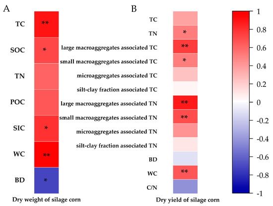 Pearson coefficients between soil physical and chemical properties and yield traits in 2022. Soil physical and chemical properties include TC, TN, SOC, SIC, POC, BD, WC, and TC of soil aggregates with different particle size fractions, TN of soil aggregates with different particle size fractions between pot experiments ((A), n = 9), and field experiment 0−20 cm soil layer ((B), n = 18). Yield traits include dry weight of silage corn grain yield, dry yield of silage corn. * p < 0.05, ** p < 0.01.