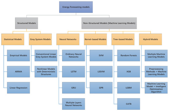 In this section, some recent literature on energy forecasting will be reviewed, and the details of the most commonly used structured and non-structured models for energy forecasting will be briefly summarized. A short discussion on the findings and research gaps will also be presented in the last subsection. For convenience, an overview of the main models for energy forecasting reviewed in this section is presented in Figure 1.