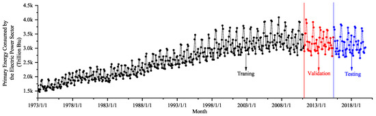 The raw data of the monthly primary energy consumption from January 1973 to January 2020 were collected from the US Energy Information Administration (EIA) website (https://www.eia.gov/totalenergy/data/monthly/ Monthly Energy Review of the US, accessed on 1 March 2020). As shown in Figure 3, the data set contains 565 points of monthly primary energy consumption of the electric power sector in the US (unit: trillion Btu). The time series data were firstly reconstructed using the steps presented in line 2 to line 5 in Algorithm 2. Then, the first 90% of points are used as in-sample data, and the remaining 10% of points are used as out-of-sample data; furthermore, the first 90% as in-sample data are finally used for training the models, and the remaining 10% of in-sample data are used for validating the performance of the models. In order to make it easier to train the machine learning models, the raw data were divided by the largest value in the in-sample data before training, and the final predicted values were multiplied by the same largest value.