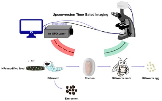 For conventional optical observation, excitation stray light and biological autofluorescence seemed inevitable when monitoring biological samples, which would seriously affect the extraction of effective signals. Time-gating, which exploited the difference in luminescence lifetime, made it possible to eliminate the interference and improve the reliability of the signals. On this basis, time-gating had made great contributions to medical imaging and biological imaging [31]. In this study, a time-gated optical imaging (TGI) setup was used to eliminate the interference from excitation stray light and biological autofluorescence, and furthermore, to realize the in situ imaging of UCNPs without damaging the original morphology of the biological samples. Silkworm cultivation experiments were conducted for one month, in which the first instar silkworms were bred to cocoons and eventually to silk moths. Silkworm excrement was monitored and collected per day throughout the larval period, and a series of other measurements on the silk from cocoons were carried out (Figure 1). To measure the spatial distribution of NPs in silkworm, samples were subjected to TGI imaging, as well as to ICP-MS analysis to quantitatively determine the lutetium content in the primary organs of silkworm. Altogether, these have established a new experimental modality for the investigation of the tissue distribution of NPs in terrestrial animals and the evaluation of the biotoxicity.