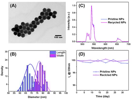 Figure 3A shows the morphology of the synthesized NPs as measured with transmission electron microscopy (TEM). The NPs ellipsoidal in shape exhibited a length of 68.4 ± 3.7 nm and a width of 60.3 ± 3.7 nm (cf. Figure 3B; the statistical results were obtained by size analysis of 100 stochastic particles). Figure 3C shows the luminescent spectra of the NPs as freshly prepared and as recycled from modified feed. They asserted an excellent Er3+ luminescence performance in the visible region under laser excitation at 980 nm. Importantly, they were almost identical, suggesting the negligible damages to the luminescence property of NPs during milling. Figure 3D exhibits the time evolution profiles of NPs-luminescence intensity. The almost undropped intensity over 34 days proves the excellent photostability of the NPs, which was crucial for its application in the long-term cultivation experiments.