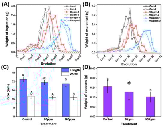 (A,B) Growth curve of silkworms through larval stage by ingestion and excretion; (C) Size of a single cocoon. Bars represent the means ± SD of the control and experimental groups. Different letters indicate significant differences among treatments (p < 0.05); (D) Weight of a single cocoon. Bars represent the means ± SD of the control and experimental groups. Different letters indicate significant differences among treatments (lowercase for Length, and capital letters for Width; p < 0.05).