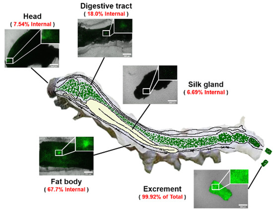 - Tansil, N.C.; Li, Y.; Koh, L.D.; Peng, T.C.; Win, K.Y.; Liu, X.Y.; Han, M.Y. The use of molecular fluorescent markers to monitor absorption and distribution of xenobiotics in a silkworm model. Biomaterials 2011, 32, 9576–9583. [Google Scholar] [CrossRef]