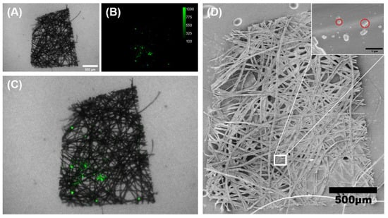 (A) Bright-field, (B) TGI and (C) superimposed images of the silk sample from a cocoon in NPs-900 ppm groups; (D) SEM images of the same sample. The upper right inset showed the higher- resolution observations for the indicated region of interests (ROI).