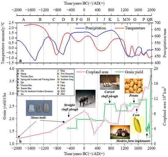In the agricultural history of the LP, the development of agricultural technology has been a key factor in both offsetting the grain yield-reducing effects of climate deterioration to promote an increase in grain yield per unit area and increasing cropland area. Grain yield per unit area, which is the main indicator assessing the level of agricultural productivity in a region, forms the material basis for a given number of people together with the area of cultivated land [28]. Key factors constraining grain yield per unit area on the LP are climate and agricultural technology. On the one hand, the LP, with its typical semi-humid and semi-arid monsoon climate, is the most sensitive region in China to climate change [31,37]; hence, climate deterioration is likely to cause crop failure [38]. Studies have shown that a 1 °C/100 mm drop in temperature/rainfall on the LP was associated with a 10% reduction in grain production [39]. On the other hand, sloping land, which accounts for more than 60% of the total cultivated area, requires a high input of agricultural power [40]. Therefore, it seems that the development of drought-resistant and agricultural power technology has become a necessary condition to increase grain yield. However, the change in climate from warm and wet to cold and dry since the Warring States (475–221 BC) did not stop the trend of increased grain yield per unit area (Figure 2a,b). Both the temperature anomaly and the rainfall showed a significant downwards trend, being above 0 °C and 500 mm before 1000 AD and below 0 °C and 500 mm after 1000 AD (Figure 2a). In contrast, grain yield per unit area increased from 1.62 t/ha in the Warring States to 4.58 t/ha in 1982 AD (Figure 2b). Thus, it can be argued that the development of agricultural technology has maintained the sustained increase in grain yield on the LP. The invention of the iron plough and the ridge cultivation technique and the introduction of drought-tolerant plants were landmark events in the history of Chinese agricultural technology. To improve agricultural power, the straight shaft plough, curved shaft plough and mechanized farming tools were invented in the Warring States in the Tang Dynasty (618–907 AD) and after the founding of the People’s Republic of China (PRC) in 1949 [3,9,41]. The ridge cultivation technique is an important drought-resistant technology that began in Western Zhou (1046–771 BC), was developed in the Warring States and matured in the Ming and Qing Dynasties (1368–1911 AD) [42]. In addition, the introduction of drought-tolerant maize and potato plants during the Ming and Qing Dynasties also contributed significantly to increased grain yield [43,44]. There is less information on agricultural activities before the Warring States, but it is not difficult to infer that grain yield per unit area was much lower in this period than that after the Warring States. In terms of agricultural technology, the period was characterized by a backwardness in all agricultural techniques and had a small probability of providing sufficient agricultural power and withstanding a dry climate. From a climate perspective, there were two climatic phases, hot dry and cold dry, before the Warring States (Figure 2a), both of which were unfavorable for crop growth. While the cropland area is largely determined by population size [45], the condition of agricultural power is another important limiting factor. Before the Warring States, cultivated land was located only in flat valleys due to the predominance of stone tools and then expanded from plains to mountains with the invention and spread of iron tools and the cattle plough [9]. Thus, the innovation of agricultural technology was an important non-demographic factor in the explosion in cropland after the Warring States (Figure 2b).