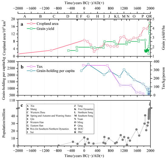 The sudden increase in population after the Warring States was due to increases in cropland area and grain yield per unit area compared to the period before the Warring States, but its exponential increase depended on tax policies, especially the reduction and abolition of the poll tax, which reduced the procreation cost. In terms of procreation decisions, people’s behaviors, both individual and collective, are choices made within the constraints of resources and policies [27]. Resources and policies should therefore rightly be important variables in examining population change. Considering that grain is the most important material for living and production in traditional agricultural societies, resource conditions can be represented by cropland area and grain yield per unit area. Policy conditions are expressed in terms of tax and marriageable age. The correspondence between the indicators and population can reflect the role of resources and policies in regulating the population. In contrast to the period before the Warring States (475–221 BC), reforms in agricultural techniques after the Warring States led to a steady increase in cropland area and grain yield per unit area, with a corresponding increase in population from less than 4 × 105 to over 5 × 106 (Figure 3a,b). However, the increase in cropland area and grain yield per unit area was not sufficient to explain the increasing population trend after the Warring States, as grain-holding per capita had a declining trend. The population grew exponentially during this period (y = 2.9719e0.0014x, n = 52, R2 = 0.7864, p < 0.01; x and y refer to years and population, respectively), with significant fluctuations (average of 5 × 106) between the Warring States and Ming Dynasty (475 BC–1644 AD), growing rapidly after the end of the Ming Dynasty and reaching 1 × 108 in 2000 AD (Figure 3c). The cropland area, which was below 4 × 104 km2 before the Warring States, increased to an average of 6.9 × 104 km2 between the Warring States and Yuan Dynasty (475 BC–1368 AD) and reached 18.7 × 104 km2 in 2000 AD (Figure 3a). The grain yield per unit area increased linearly from 1.62 t/ha in the Warring States to 2.75 t/ha in 1840 AD and reached an all-time high (4.58 t/ha) in 2000 AD (Figure 3a). In contrast, there was a declining trend in grain-holding per capita (Figure 3b). In terms of policies, almost every dynasty, such as Western Zhou (1046–771 BC), Spring and Autumn (770–476 BC), Western Han (206 BC–25 AD), Southern-North Dynasty (420–581 AD), Tang Dynasty (618–907 AD), Song Dynasty (907–1279 AD) and Qing Dynasty (1644–1911 AD), tried to lower the marriageable age to stimulate population growth, with the marriageable age for women being 20, 17, 15, 15, 13 and 14 years, respectively [46,47]. However, the marriageable age remained largely unchanged at 15 years old, which is also insufficient in explaining the increasing population trend.