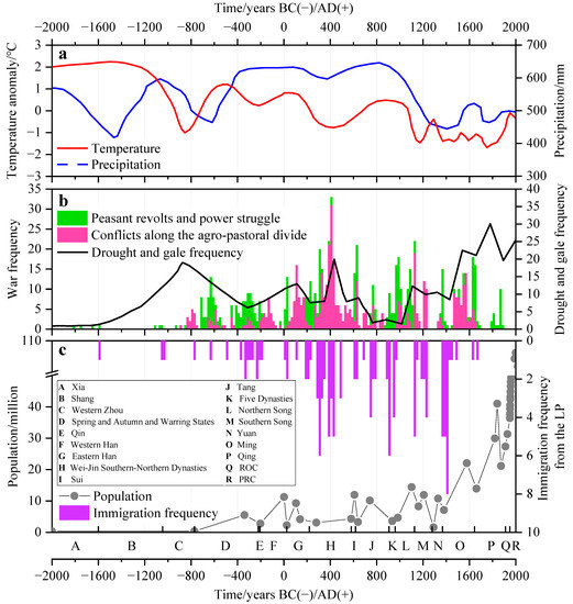 Migration frequency was obtained statistically with a temporal resolution of 20 years based on the first volume of The History of Chinese Migration [30]. Here, migration refers to the forced movement of the population off the LP as a result of war, disasters and policies.